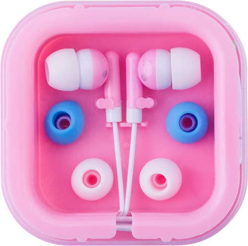 Kopfhörer aus Kunststoff/Metall, Kabellänge ca. 100 cm, mit zwei Paar Ersatz-Kopfhörerschützern (2 Farben), verpackt in einer Kunststoffbox mit transparentem Deckel.