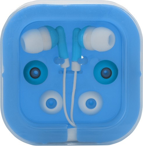 Kopfhörer aus Kunststoff/Metall, Kabellänge ca. 100 cm, mit zwei Paar Ersatz-Kopfhörerschützern (2 Farben), verpackt in einer Kunststoffbox mit transparentem Deckel.
