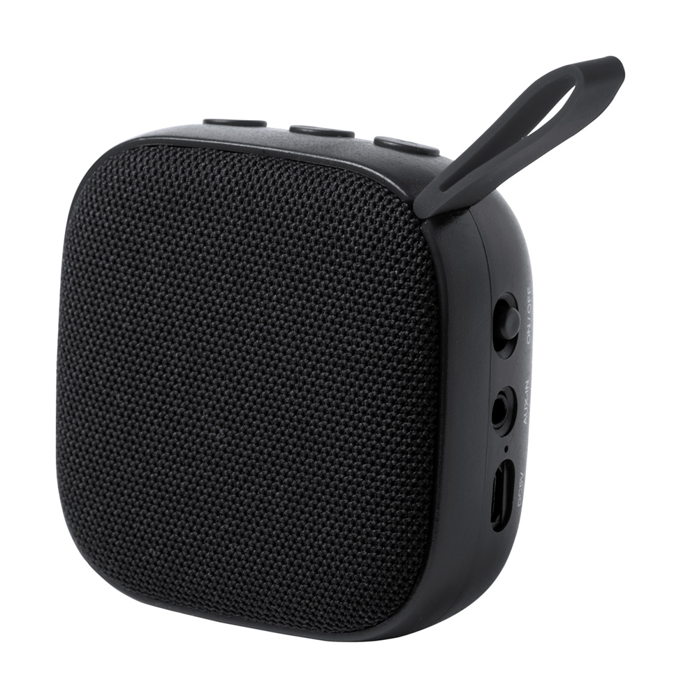 Bluetooth-Lautsprecher mit Freisprechfunktion, FM Radio und wiederaufladbarem Akku. Material: Gehäuse aus Kunststoff, Lautsprecherbezug aus Polyester (farblich abgestimmt). Inkl. USB-Ladekabel.