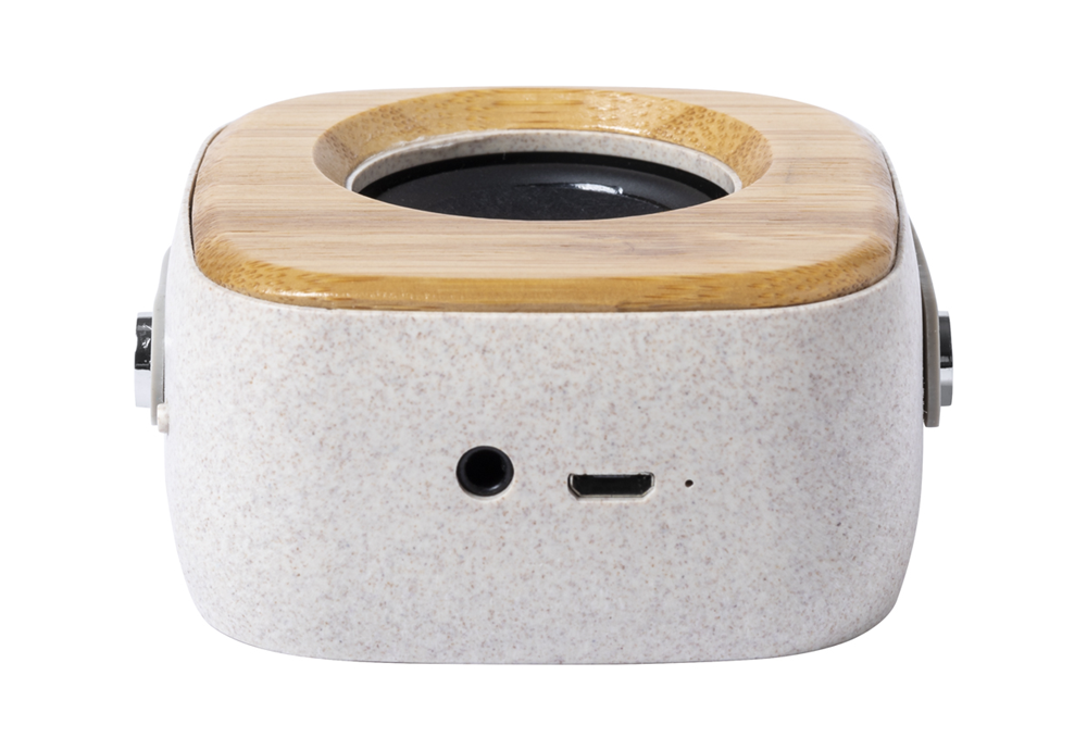 Bluetooth-Lautsprecher mit eingebautem Akku. Gehäuse aus Bambus und ökologischem Weizenstroh. Inkl. Ladekabel.