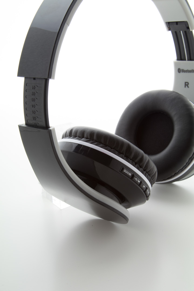 Faltbare Bluetooth-Kopfhörer aus Kunststoff mit eingebauem Akku, Freisprech-Funktion und Micro-SD-MP3-Wiedergabe-Funktion. Inkl. 3,5mm Audio-Stecker und USB-Ladekabel.