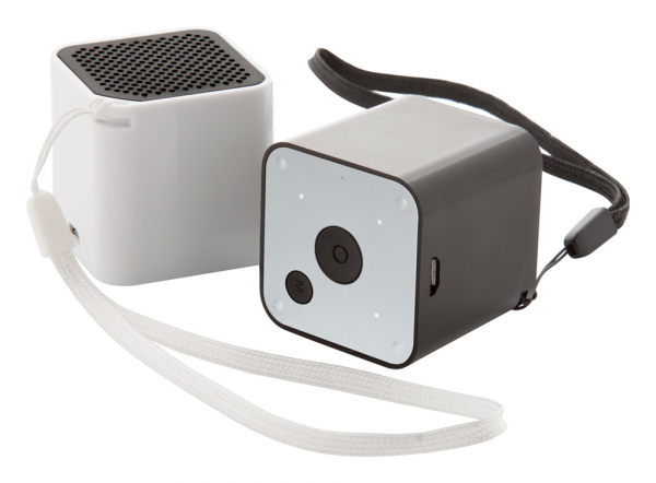 Bluetooth-Lautsprecher mit Kunststoffgehäuse, Kamera-Auslösefunktion und aufladbarem Akku. Inkl. USB-Ladekabel.