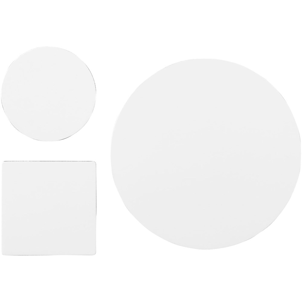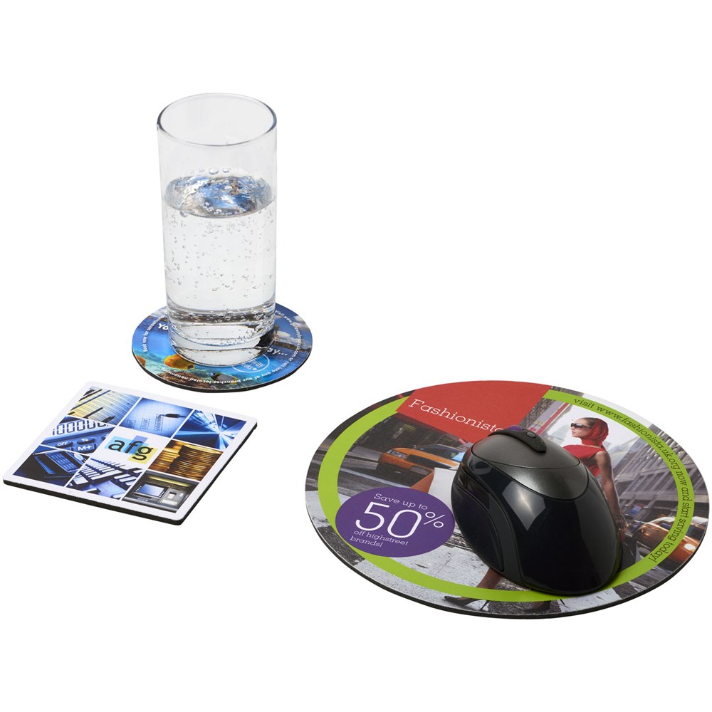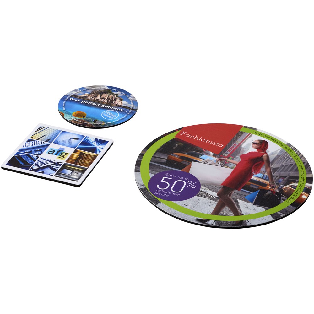 Besteht aus einem Q-Mat® Mousepad und einem Set aus zwei passenden Untersetzern versehen mit Ihrem Firmendesign. Das Set besteht aus einem runden Mousepad (0,3 x ø 20 cm), einem quadratischen (0,3 x 9,8 x 9,8 cm) und einem runden Untersetzer (0,3 x ø 9,8 cm).