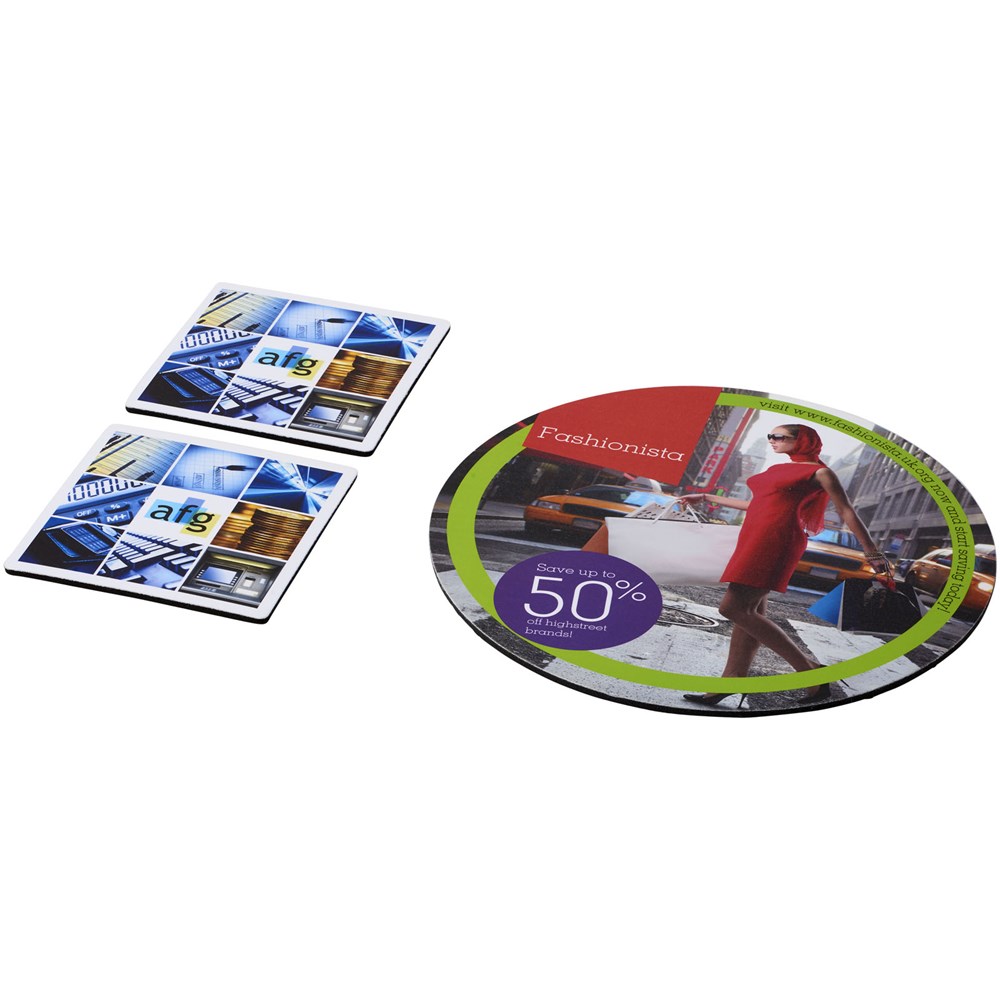 Besteht aus einem Q-Mat® Mousepad und einem Set aus zwei passenden Untersetzern versehen mit Ihrem Firmendesign. Das Set besteht aus einem runden Mousepad (0,3 x ø 20 cm) und zwei quadratischen Untersetzern (0,3 x 9,8 x 9,8 cm).