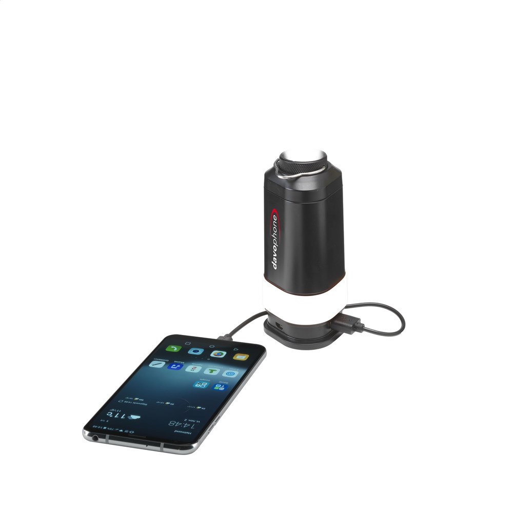 Kompakte, multifunktionale ABS-Campingleuchte mit integriertem Ladegerät. Die 1-Watt-LED-Leuchte kann auf 2 Modi eingestellt werden: konstantes helles Weißlicht oder blinkendes rotes Licht (Signalleuchte). Kann als Tischleuchte, Taschenlampe oder Pendelleuchte verwendet werden. Das Ladegerät ist mit einer Lithium-Ionen-Batterie (6000 mAh) und einer beleuchteten Batterieanzeige ausgestattet. Geeignet zum Aufladen der gängigsten mobilen Geräte. Einschließlich Schlaufe zum Aufhängen, Magnet, USB-zu-Micro-USB-Kabel und Bedienungsanleitung.