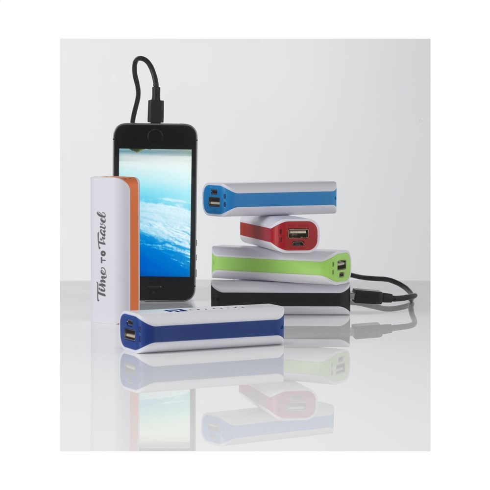 ABS-Powerbank mit integrierter Lithium-Ionen-Batterie (2200 mAh/3,7 V). Eingang: 5 V - 800 mA Ausgang: 5 V - 1 A. Die Powerbank kann mit dem gelieferten USB-Kabel über USB aufgeladen werden. Geeignet für die meisten mobilen Geräte. Einschl. Anweisungen.