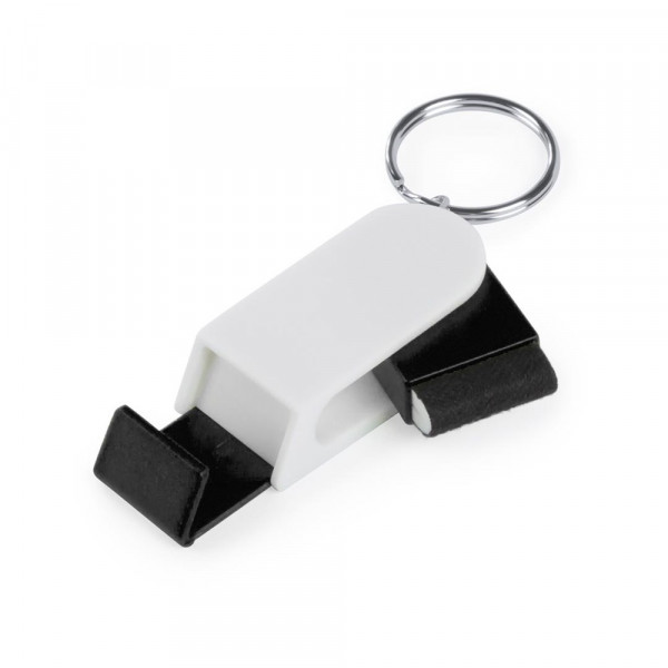 Origineller Schlüsselanhänger mit elegantem, zweifarbigem Design sowie integriertem Smartphone-Ständer und Bildschirmreiniger mit Drehmechanismus.