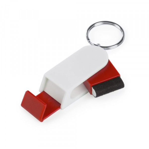 Origineller Schlüsselanhänger mit elegantem, zweifarbigem Design sowie integriertem Smartphone-Ständer und Bildschirmreiniger mit Drehmechanismus.