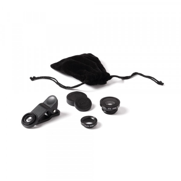 3-teiliges Set aus Universal-Objektiven für Smartphones -hergestellt aus Aluminium und Glas. Befestigung an der Kamera mittels Clip. Enthält Fischauge, Makro und Weitwinkel sowie ein Mikrofaser-Reinigungstuch. Die Objektive werden in einem Samtbeutel mit Kordelzug präsentiert, das Set in einer attraktiven Designbox.