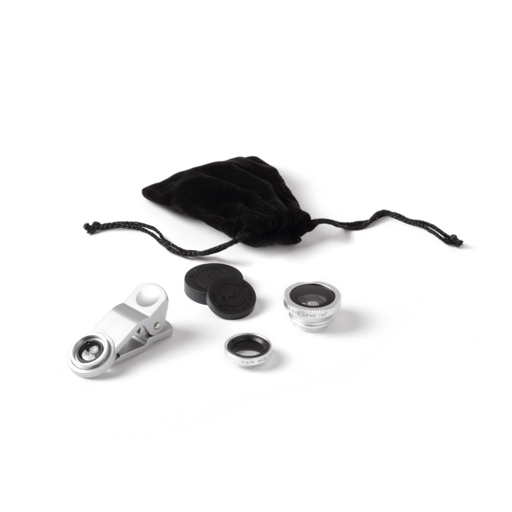 3-teiliges Set aus Universal-Objektiven für Smartphones -hergestellt aus Aluminium und Glas. Befestigung an der Kamera mittels Clip. Enthält Fischauge, Makro und Weitwinkel sowie ein Mikrofaser-Reinigungstuch. Die Objektive werden in einem Samtbeutel mit Kordelzug präsentiert, das Set in einer attraktiven Designbox.