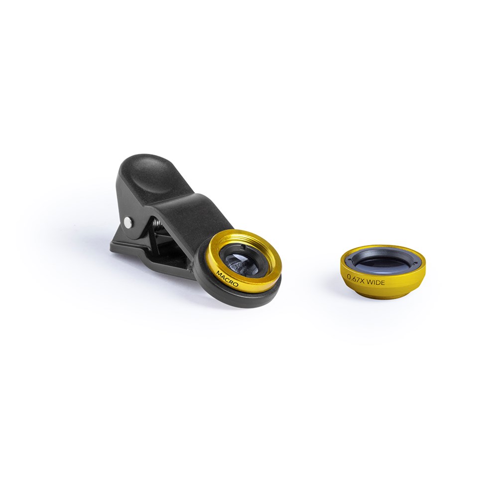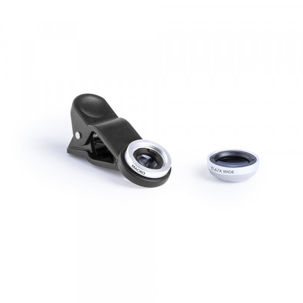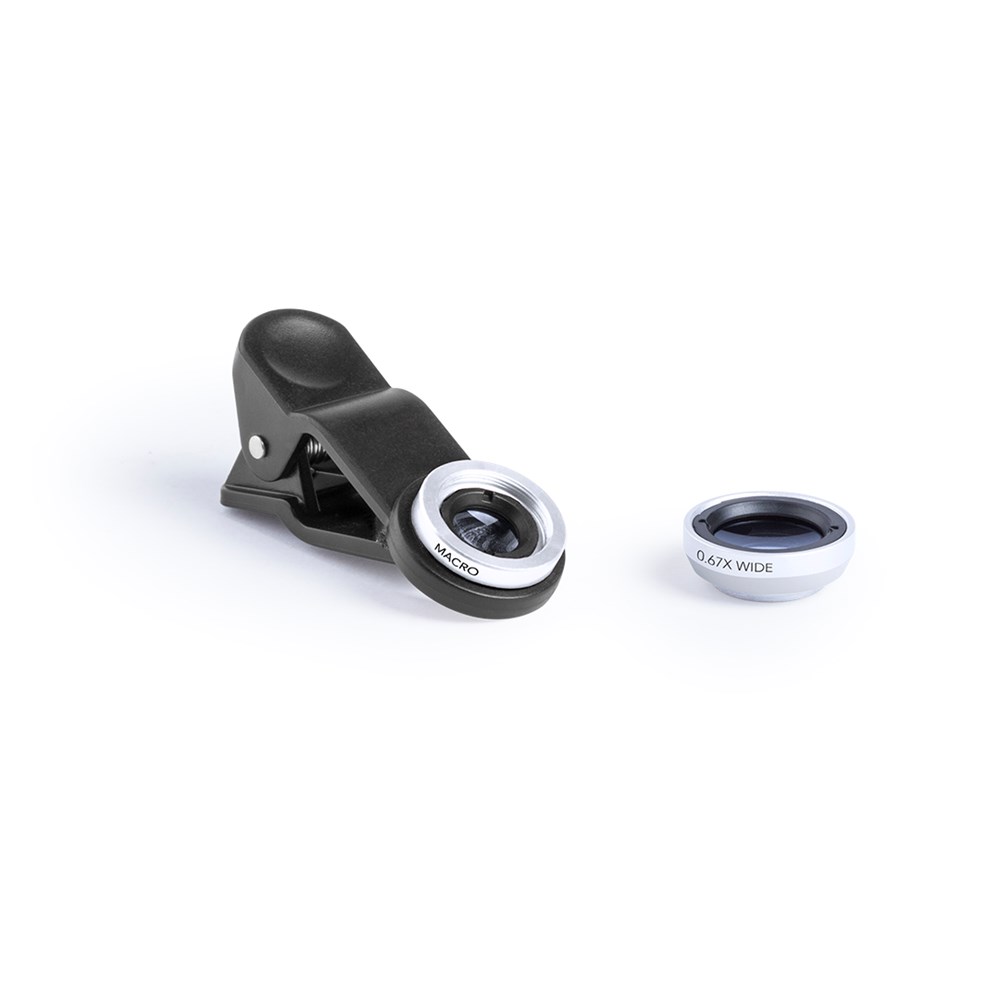 Set aus Universal-Objektiven für Smartphones - mit Clip zum Befestigen. Hergestellt aus Aluminium und Glas. Enthält Makro und Weitwinkel sowie ein Mikrofaser-Reinigungstuch. Objektive werden in einem Samtbeutel mit Kordelzug präsentiert. Set präsentiert in einer attraktiven Designbox.