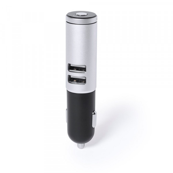 USB-Ladegerät aus Aluminium für KFZ-Zigarettenanzünder mit Ladekapazität von 2.100 mAh. Mit Dual-USB-Ausgang für das gleichzeitige Laden von zwei Mobilgeräten. Zudem mit Freisprechfunktion via Bluetooth® mit integriertem Bedienfeld und Bluetooth®-Kopfhörer mit Befestigungssystem mittels Magnet sowie halbtransparentem Deckel mit LED-Ladeanzeige. Präsentiert in einer individuellen Box.