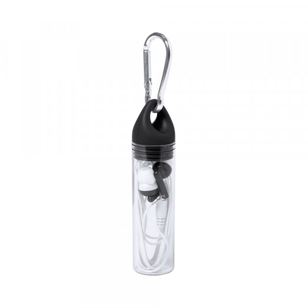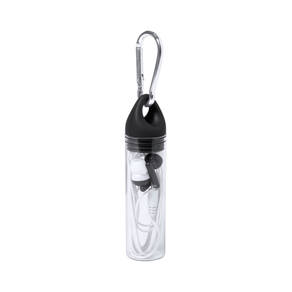 Zweifarbige In-Ear-Kopfhörer mit 3,5-mm-Klinkenstecker und weißem Kabel. Mit Ohrstöpseln in vielen Farben - speziell für den Tampondruck entwickelt. Präsentiert in einem originellen zylinderförmigem Gehäuse in transparenter Ausführung mit Schraubdeckel und Befestigungskarabiner in passender Farbe.