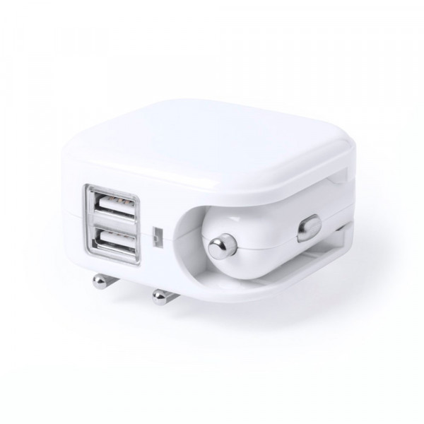 Kompaktes USB-Ladegerät mit minimalistischem Design in Weiß. Kompatibel mit Steckdose und KFZ-Zigarettenanzünder. Zusammenklappbar und mit Dual-USB-Ausgang für das gleichzeitige Laden von zwei Mobilgeräten.