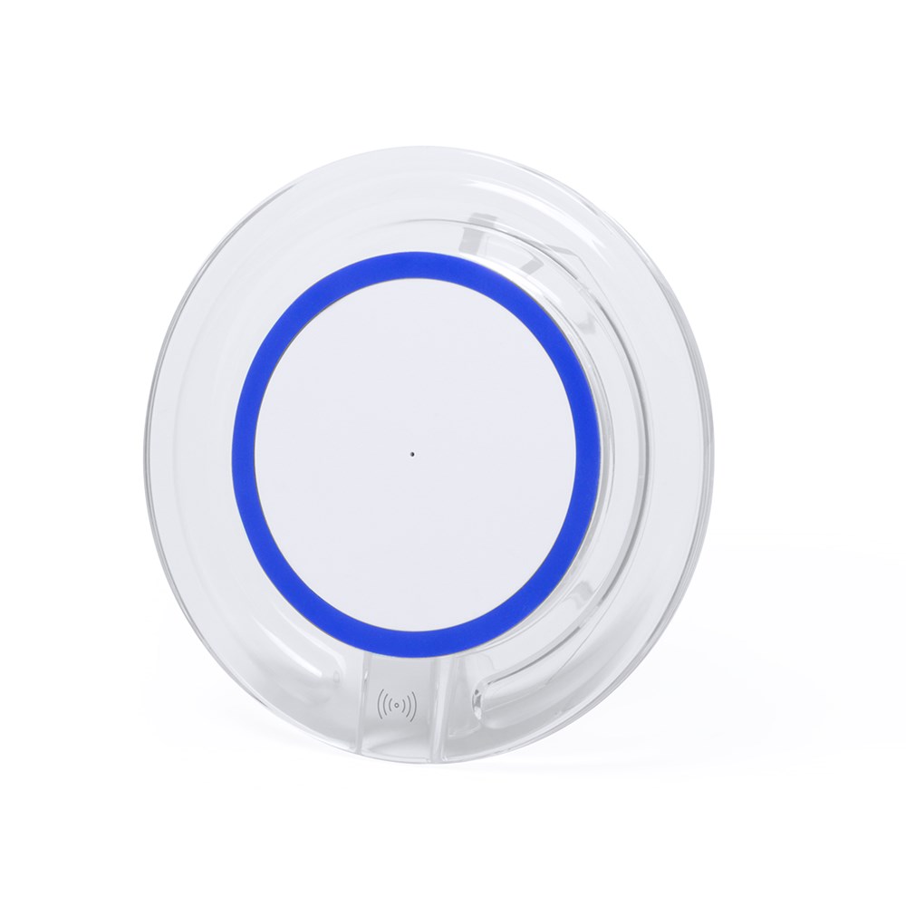 Kabelloses, rundes Ladegerät mit QI-Technologie (induktive Energieübertragung) und transparentem Gehäuse in verschiedenen lebendigen Farben. Mit rutschfester Unterseite und LED-Ladeanzeige. Kompatibel mit Geräten, die mit kabelloser Ladetechnik ausgestattet sind. Präsentiert in einer attraktiven Designbox.