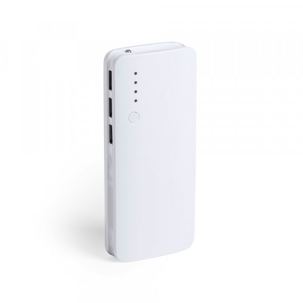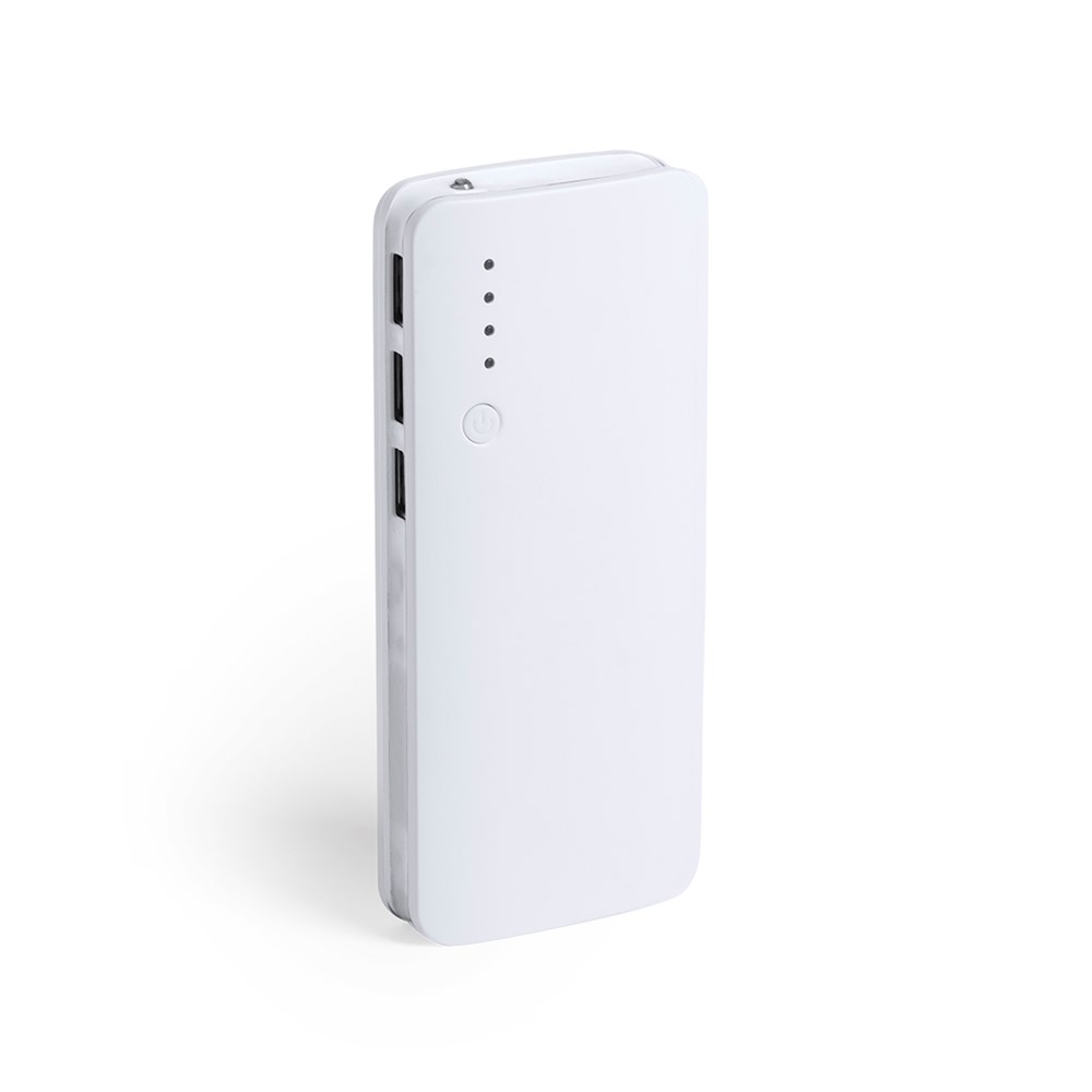 Externer Akku mit hoher Ladekapazität von 10.000 mAh und dreifachem USB-Ausgang für das gleichzeitige Laden von bis zu 3 Mobilgeräten. Mit weißem Gehäuse mit abgerundetem Design und Seiten in lebendigen Farben, sowie LED-Ladeanzeige und großer Druckfläche. Präsentiert in einer attraktiven Designbox.