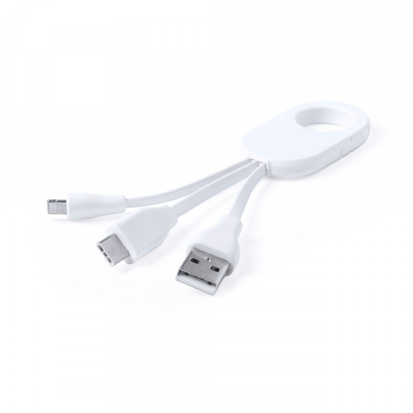 USB-Ladekabel mit USB-C- sowie Micro-USB-/Lightning-Anschluss. Mit minimalistischem Design in Weiß, integriertem Karabiner und glatter Druckfläche.