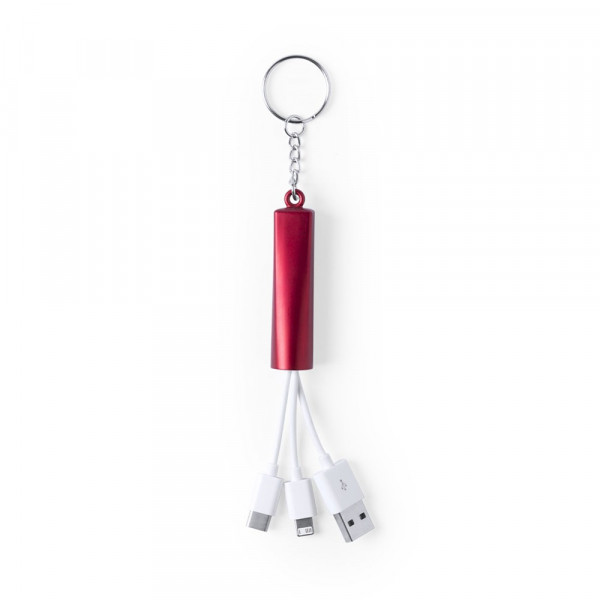 Schlüsselanhänger mit integriertem Ladegerät in einer Vielzahl von Metallic-Farben. Mit LED-Ladeanzeige und USB-C-, Micro-USB- und Lightning-Anschluss.