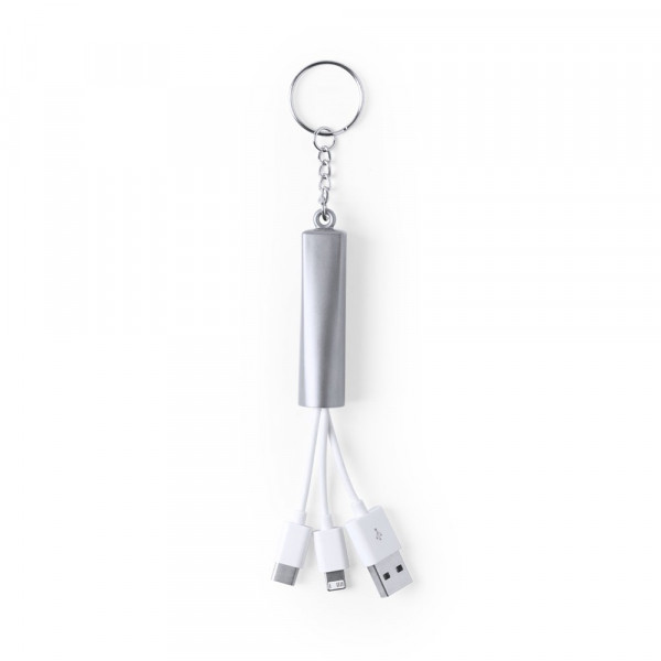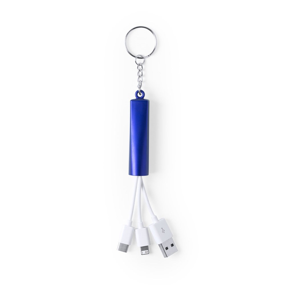 Schlüsselanhänger mit integriertem Ladegerät in einer Vielzahl von Metallic-Farben. Mit LED-Ladeanzeige und USB-C-, Micro-USB- und Lightning-Anschluss.