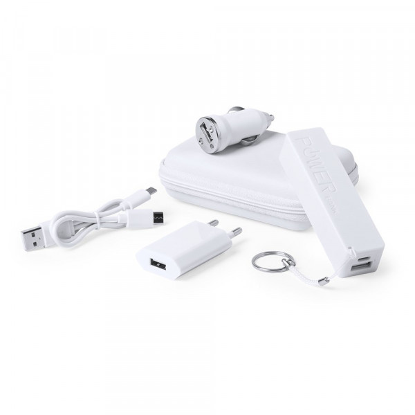 Set aus externem Akku mit 2.000 mAh Ladekapazität, Ladegerät für KFZ-Zigarettenanzünder und Wand-Ladegerät - beide mit 1.000 mA Ladekapazität. Präsentiert in einem robusten Kunstleder-Etui in passender Farbe. Inklusive Dual-Kabel mit Micro-USB-/Lightning- und USB-C-Anschluss.