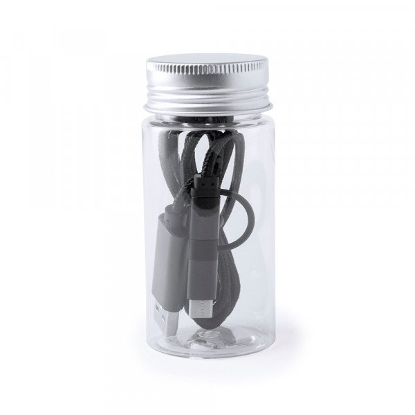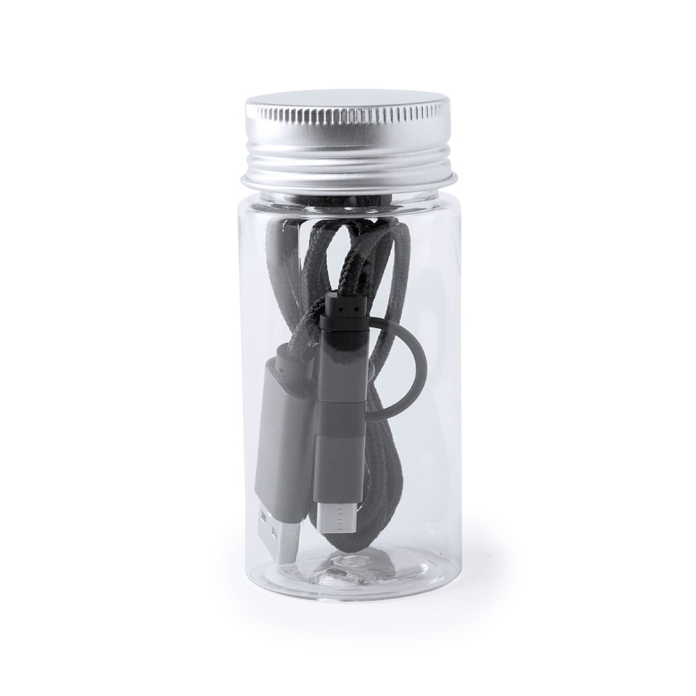 USB-C-Ladekabel mit dualem Micro-USB/Lightning-Anschluss von 100 cm Länge. Mit extra robuster Nylonbeschichtung für intensiven Gebrauch und Aluminiumsteckern - speziell für den Laserdruck entwickelt. Erhältlich in einer Vielzahl von Farben. Präsentiert in einer attraktiven, transparenten Dose mit Schraubverschluss.