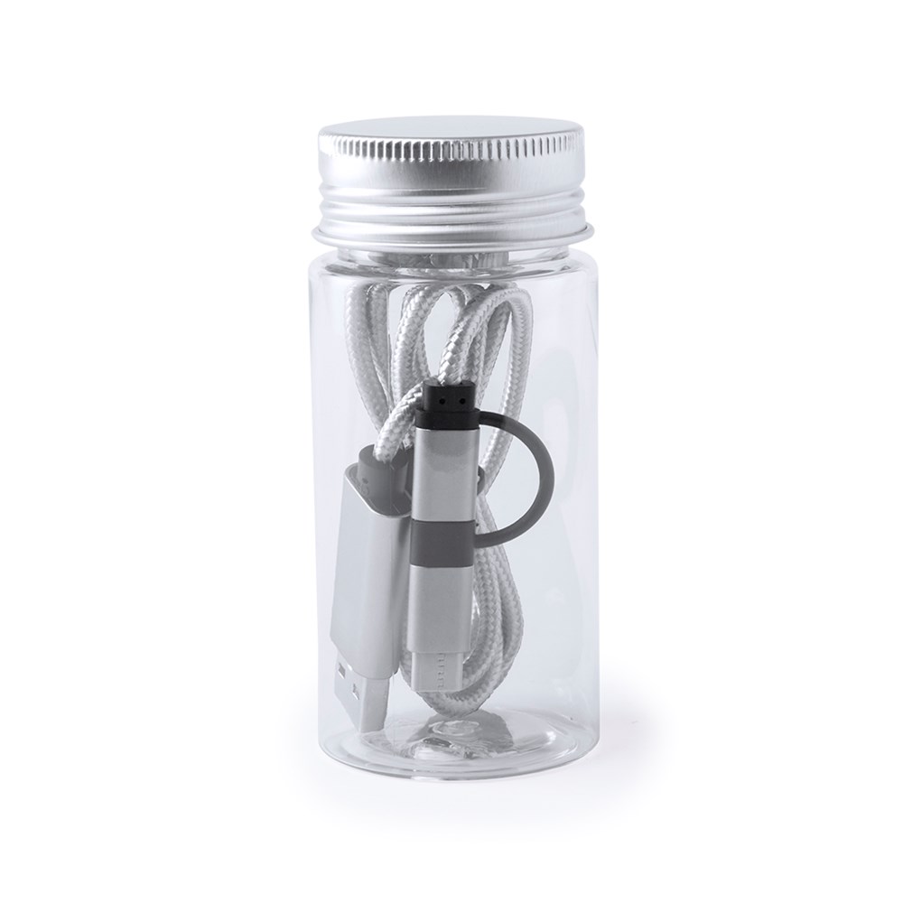USB-C-Ladekabel mit dualem Micro-USB/Lightning-Anschluss von 100 cm Länge. Mit extra robuster Nylonbeschichtung für intensiven Gebrauch und Aluminiumsteckern - speziell für den Laserdruck entwickelt. Erhältlich in einer Vielzahl von Farben. Präsentiert in einer attraktiven, transparenten Dose mit Schraubverschluss.