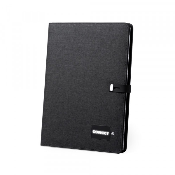 Mappe aus robustem 300D Polyester mit integrierter Powerbank mit 4.000 mAh Ladekapazität. Schlichtes Design mit originellem Verschluss und Druckfläche auf der Front, die speziell für den Laserdruck entworfen wurde und das Logo von innen mittels LED beleuchtet. Mit einer Vielzahl von Fächern zur Aufbewahrung von Visitenkarten und USB-Sticks. Inklusive Halterung mit kabellosem Ladegerät für Smartphones, LED-Ladeanzeige und USB-Ausgang für normales Laden. Notizblock mit 20 Blättern. Der einfache Zugriff auf den externen Akku mittels Micro-USB-Kabel (inklusive), machen aus dieser Mappe das perfekte Gadget für Business und Studium. Präsentiert in einer eleganten Box in Schwarz.