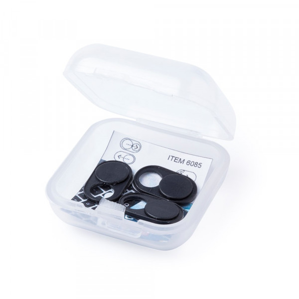 Cover für Webcam zum Schutz der Privatsphäre. In ultrakompakter Größe und verpackt in einer individuellen, halbtransparenten Dose mit 3 Stück. Erhältlich in den Farben Weiß und Schwarz. Präsentiert in einem individuellen Beutel mit Kartoneinlage.