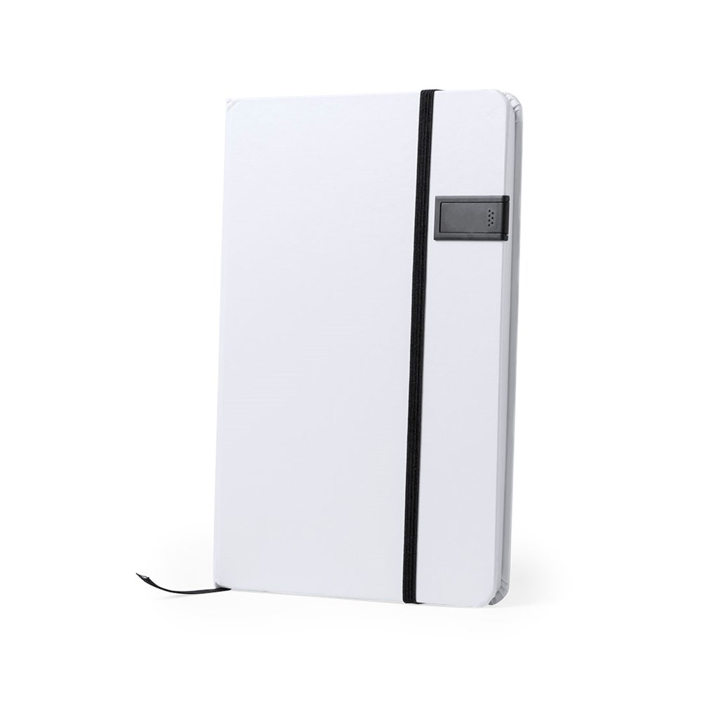 Notizblock mit coolem Design in Weiß. Mit im Cover integriertem USB-Speicher von 16 GB, Gummibandverschluss und Lesezeichenband in passender Farbe. Mit 100 linierten Blättern. Erhältlich in verschiedenen lebendigen Farben.