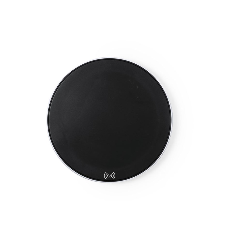 Kabelloses Ladegerät in runder Bauform mit rutschfestem Boden. LED-Anzeige für den Ladestatus, einschließlich Mikro-USB-Kabel, kompatibel mit Smartphones mit kabelloser Ladetechnologie. Präsentiert in einer attraktiven Design-Box.
