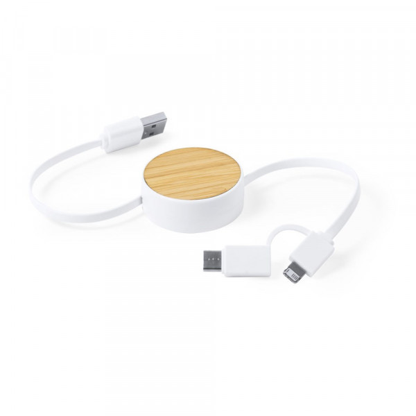 Naturlinie, einziehbares Ladegerät in ultrakompaktem Design. Hergestellt aus Bambus, aus natürlich geschnittenen Bambusstücken. Typ C und zwei Mikro-USB-Beleuchtungsanschlüsse. Breite Druckfläche und in einer attraktiven, individuellen Öko-Design-Box erhältlich.