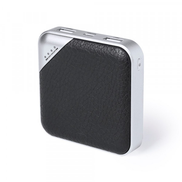 Externer Akku von Antonio Miró mit hoher Ladekapazität von 5.000 mAh. Mit Ein- und Ausgang für USB-C sowie Dual-USB-Ausgang für das gleichzeitige Laden von bis zu 3 Geräten. Mit Gehäuse aus einer eleganten Kombination von Leder und Metall, sowie LED-Ladeanzeige. Präsentiert in einer individuellen Box mit Fenster und Markenlogo.