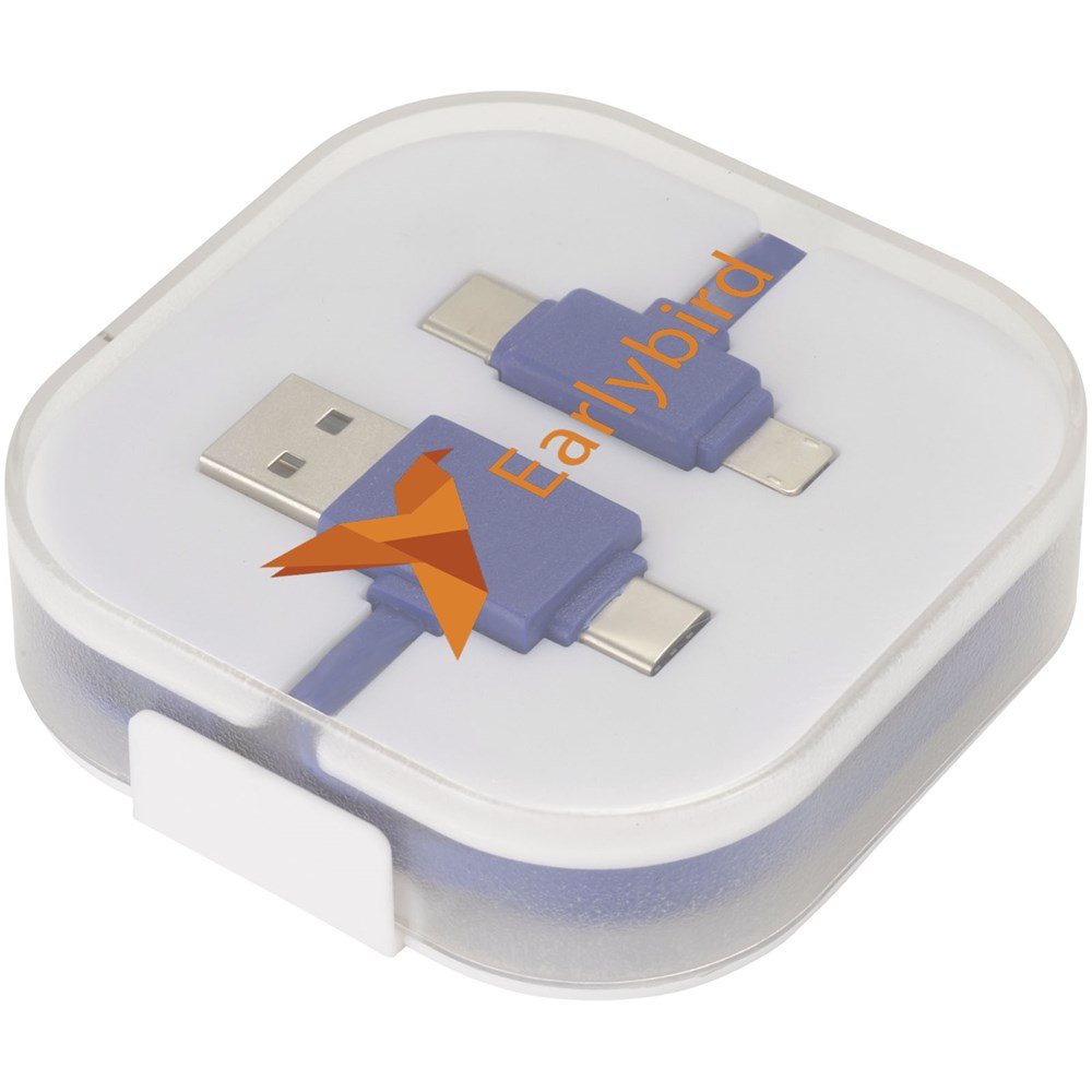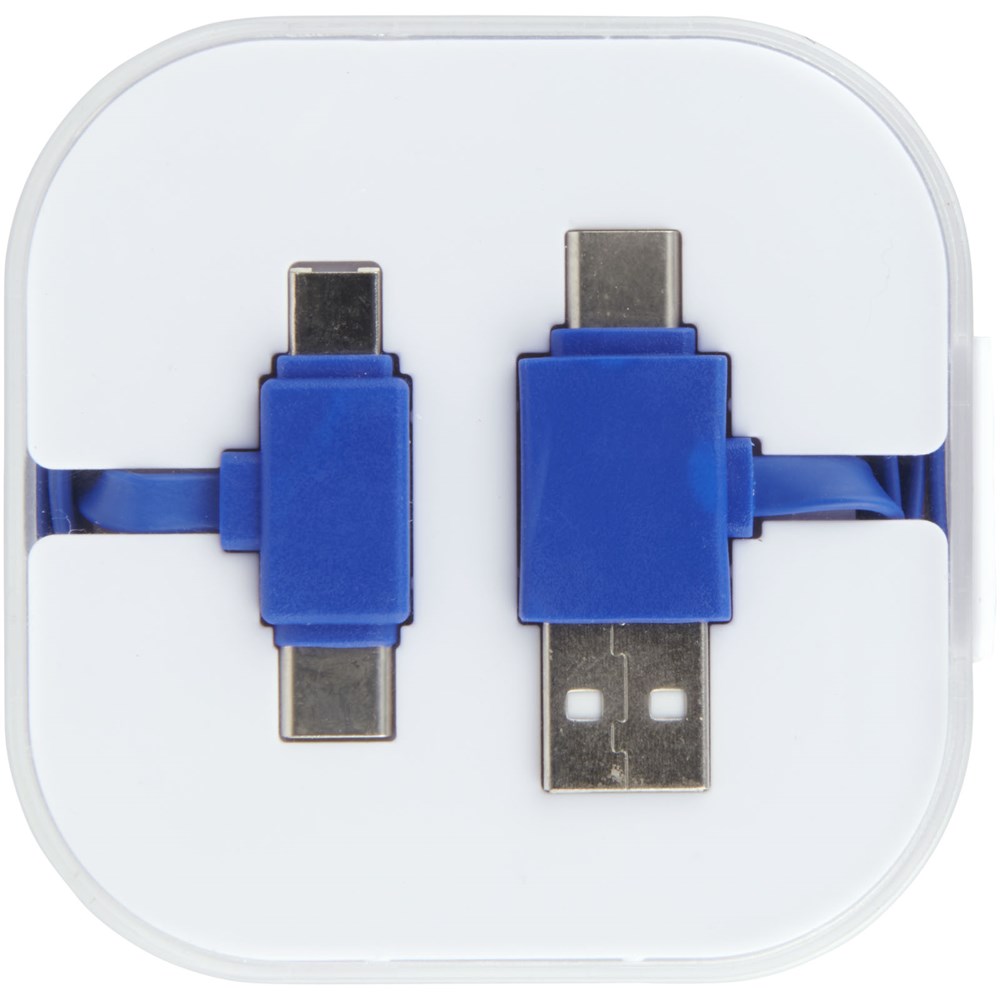 Das 4-in-1-Ladekabel in einer Hülle hat zwei Typ C, einen USB-Typ A und einen 2-in-1-Dual-kompatibelen Anschluss für Apple iOS und Android Geräte. Sowohl Ladefunktion als auch Datentransfer. Um Apple Geräte zu laden, nutzen Sie das Kabel mit der Seite, das keine Pins hat. Zum Laden von Android Geräten das Kabel mit der Seite nutzen, dass Pins hat.