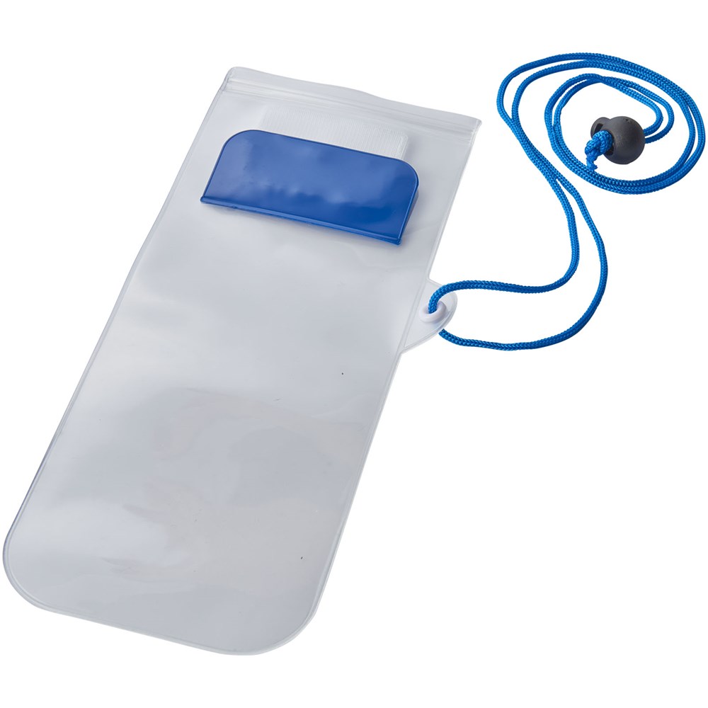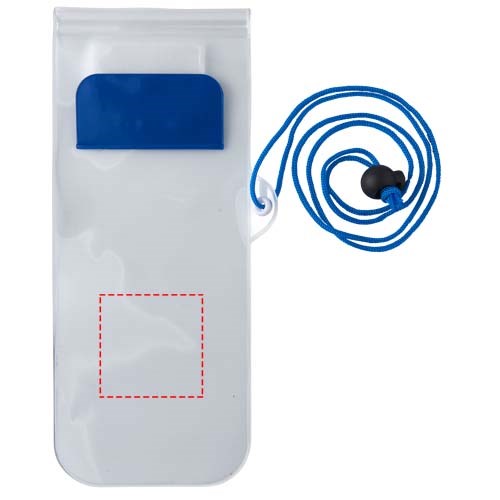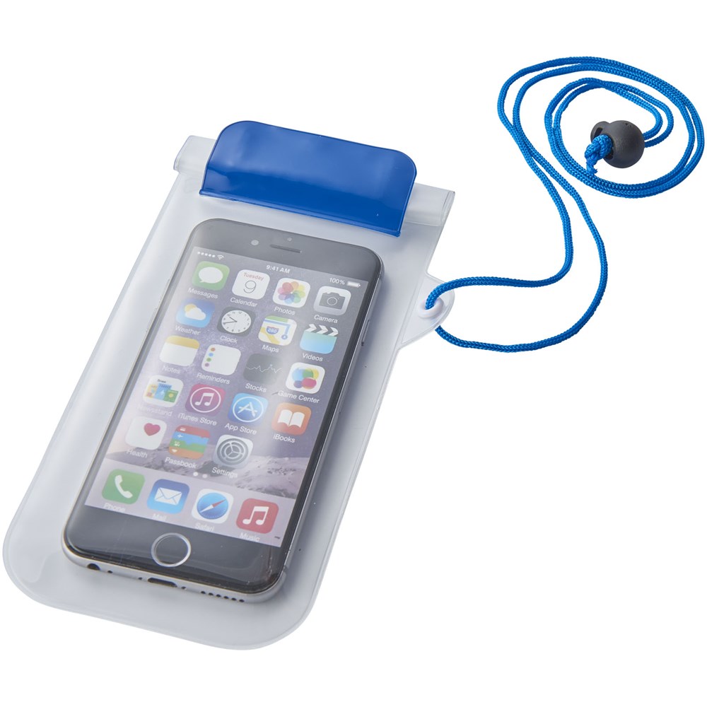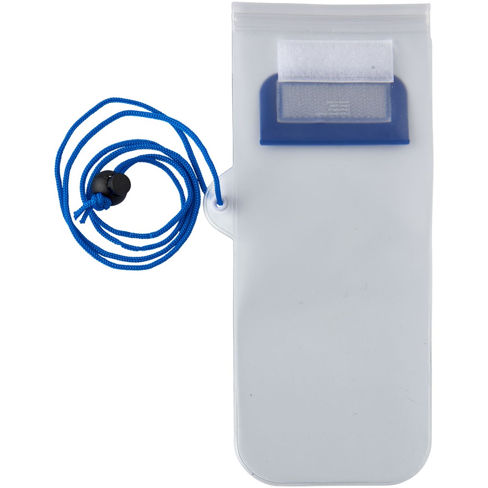 Aufbewahrungsbeutel mit milchiger, weißer Rückseite, transparentem, klarem Touchscreen Frontfenster mit Reißverschluss und farbigem Überschlag mit Klettverschluss. Inklusive Nackenband mit Kordelzug.
