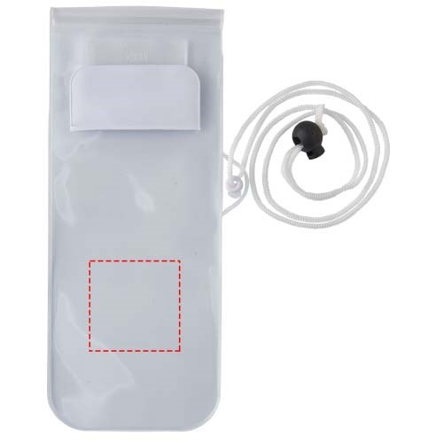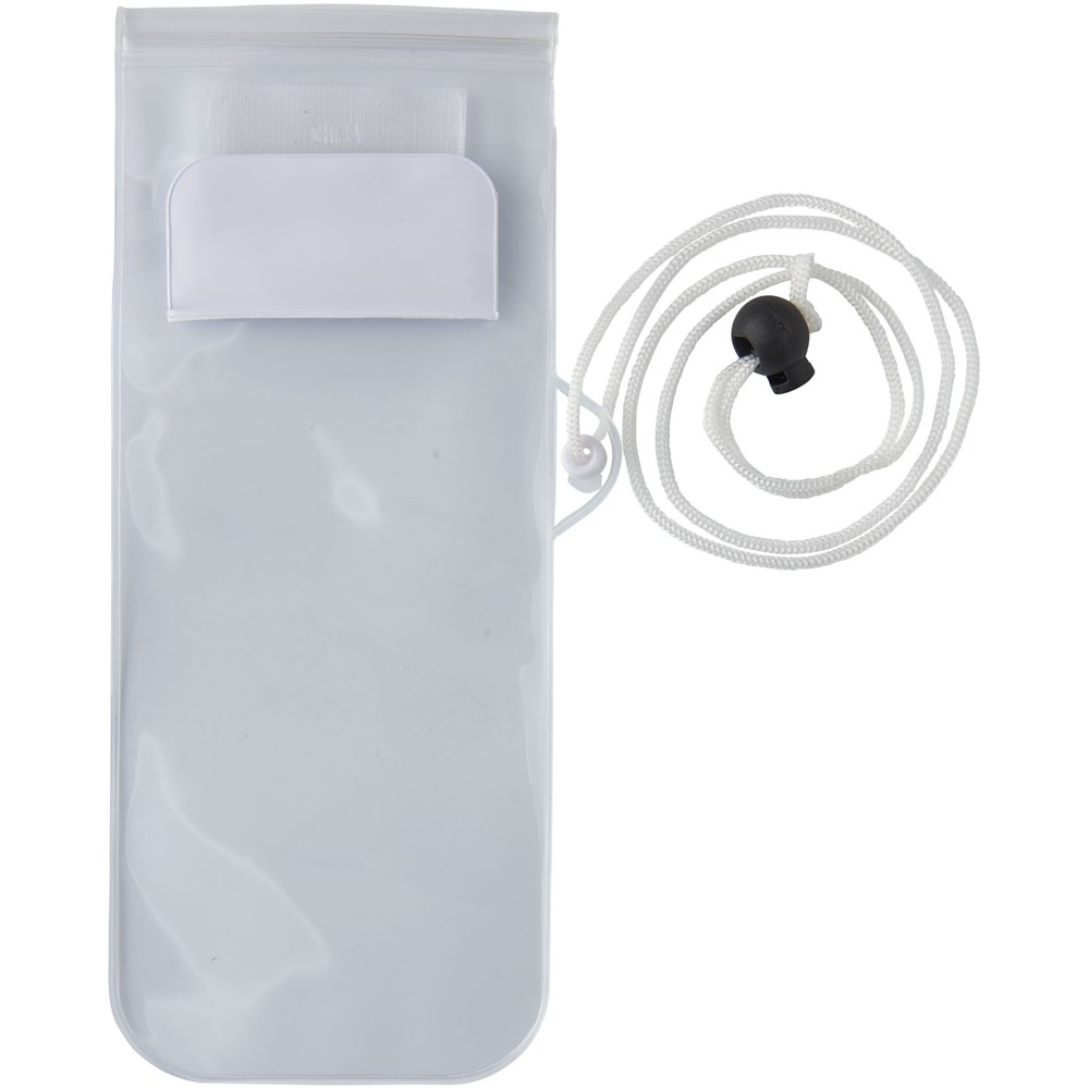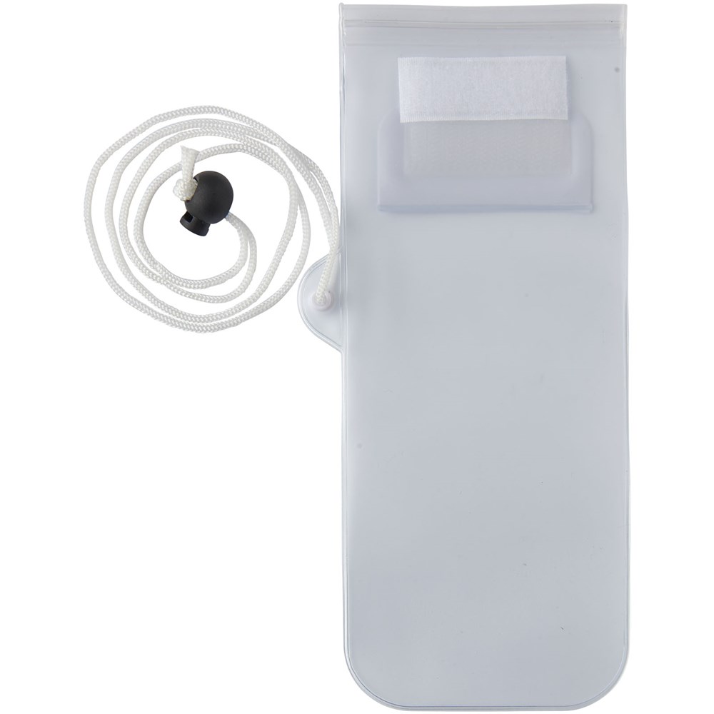 Aufbewahrungsbeutel mit milchiger, weißer Rückseite, transparentem, klarem Touchscreen Frontfenster mit Reißverschluss und farbigem Überschlag mit Klettverschluss. Inklusive Nackenband mit Kordelzug.