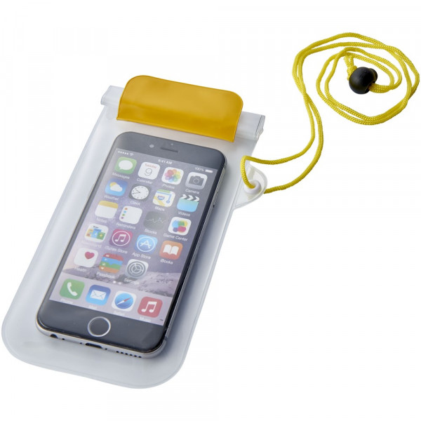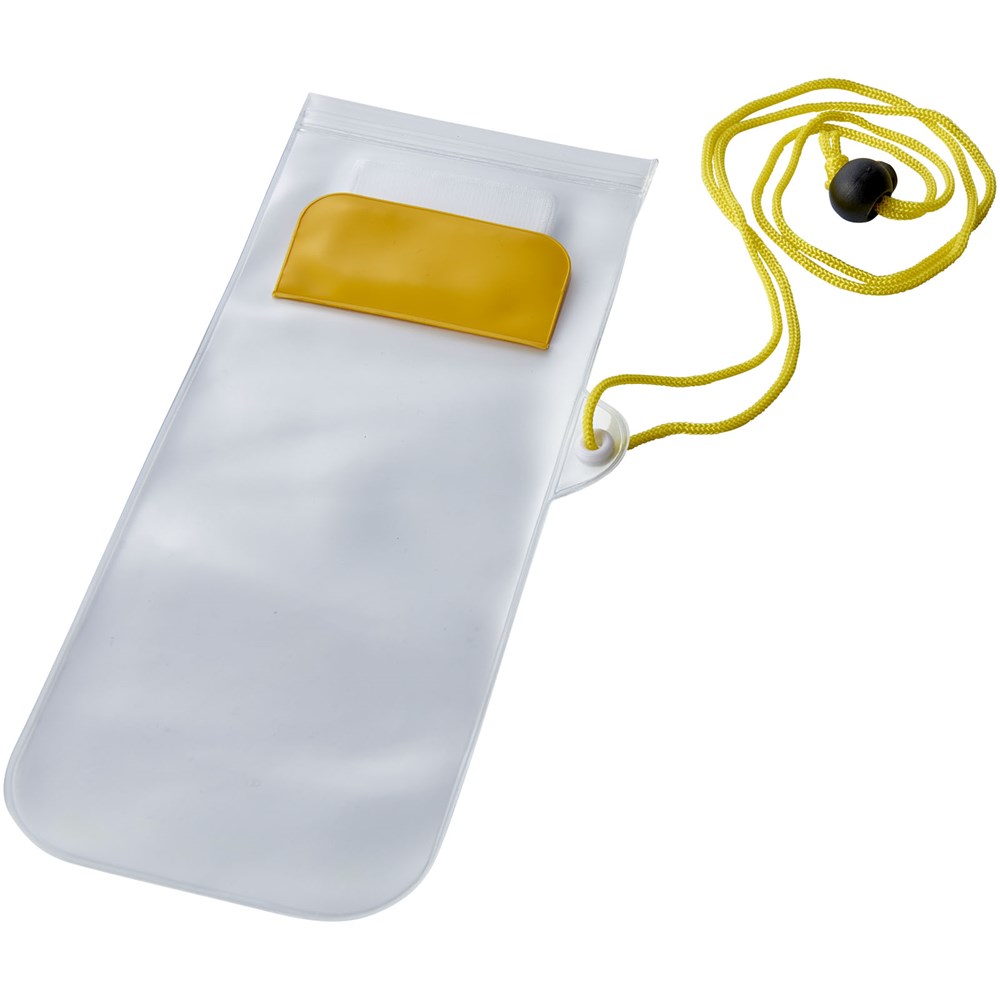 Aufbewahrungsbeutel mit milchiger, weißer Rückseite, transparentem, klarem Touchscreen Frontfenster mit Reißverschluss und farbigem Überschlag mit Klettverschluss. Inklusive Nackenband mit Kordelzug.