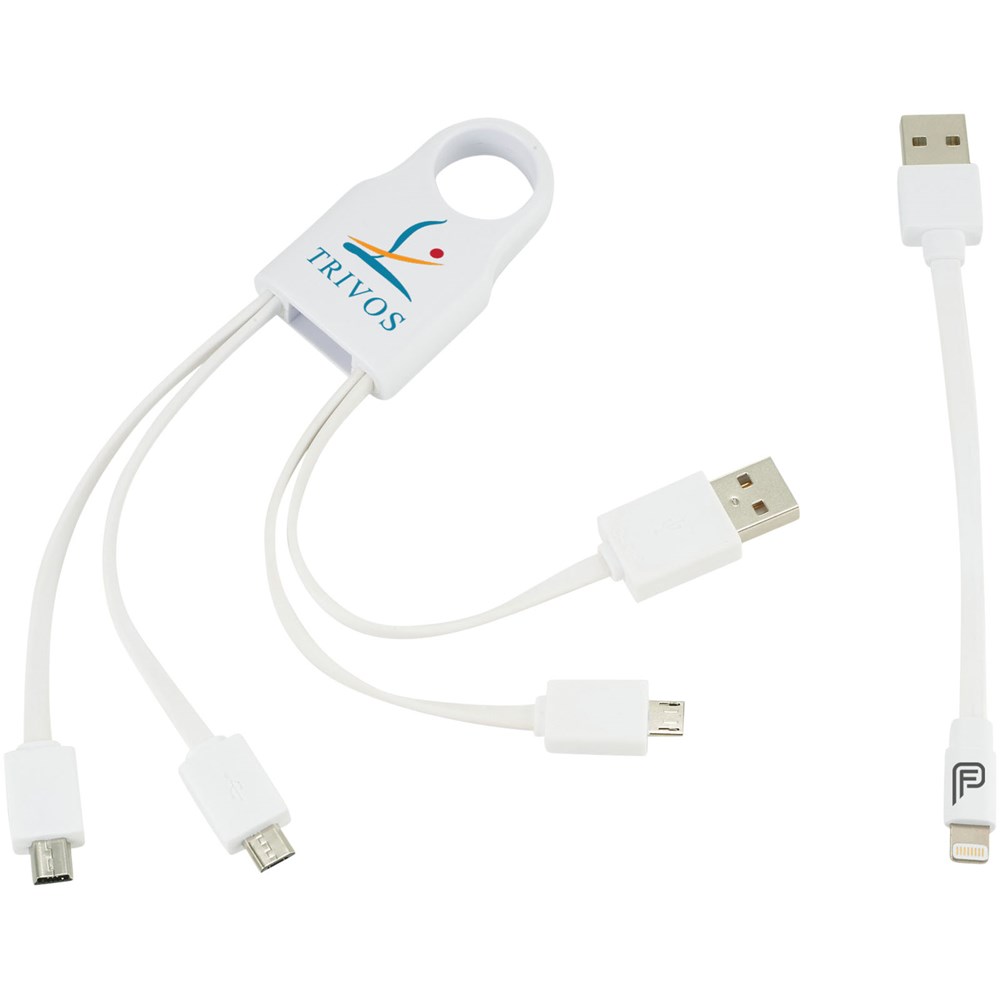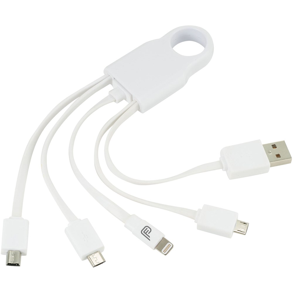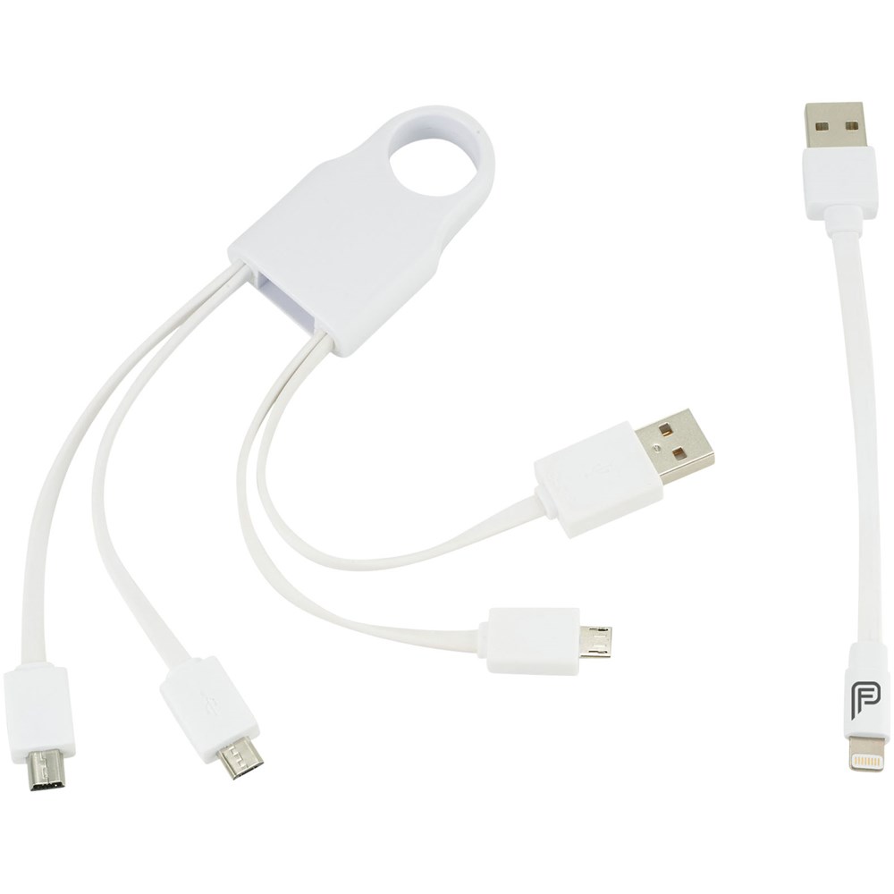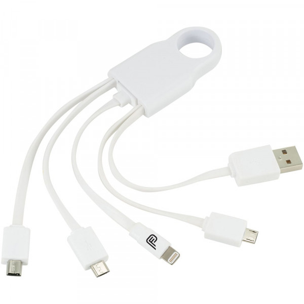 USB Ladekabel mit 5 Anschlüssen, USB Adapter, zwei Micro-USB Adapter, Mini USB Adapter und abnehmbarer MFi zertifizierter Apple® Lightning™ Adapter. Nur ein Micro-USB Adapter und der MFi Lightning™ Adapter unterstützen die Datenübertragung.