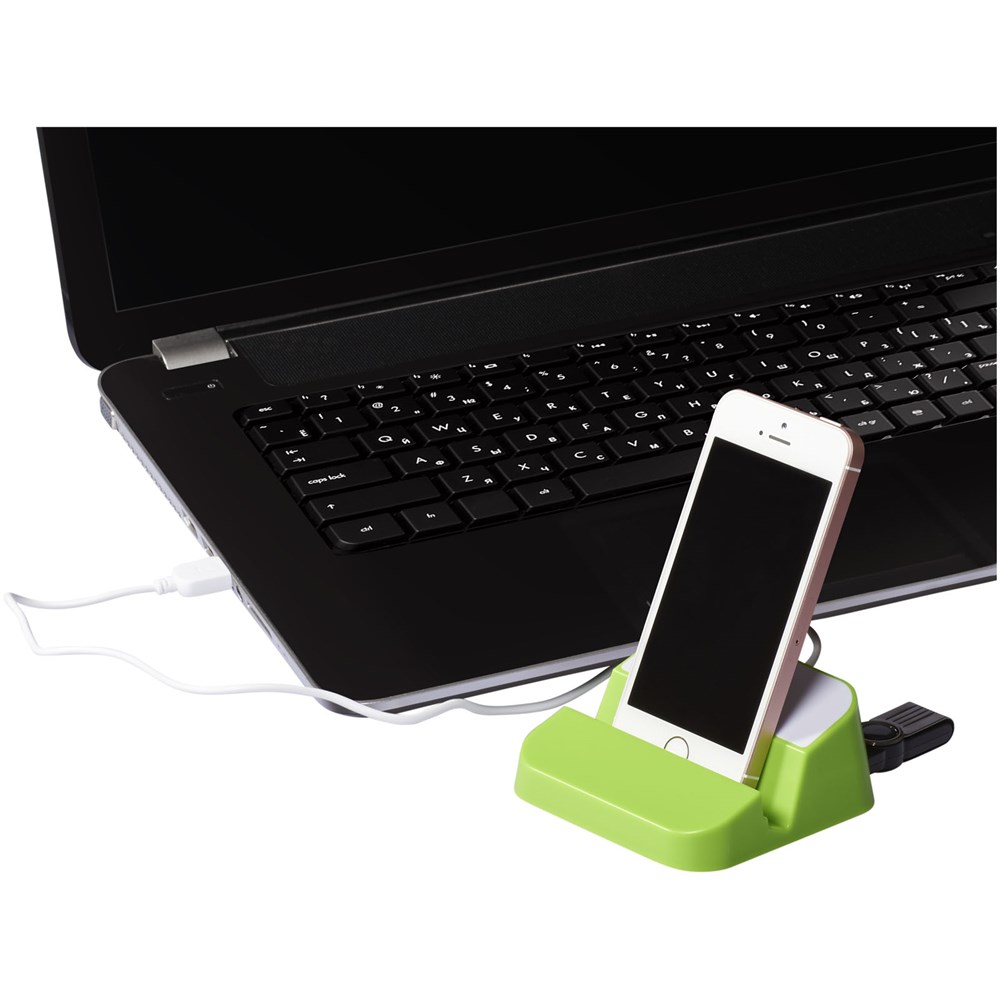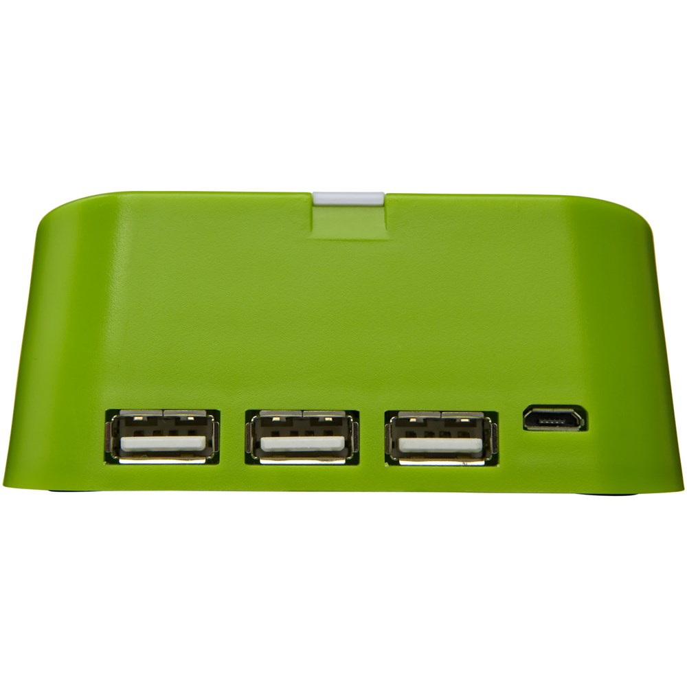 3 Port USB 2.0 Hub, kompatibel mit jedem USB Port. Es kann auch als Telefon- oder Tablethalter mit Kabelaufbewahrung genutzt werden. Inklusive Micro-USB Ladekabel.