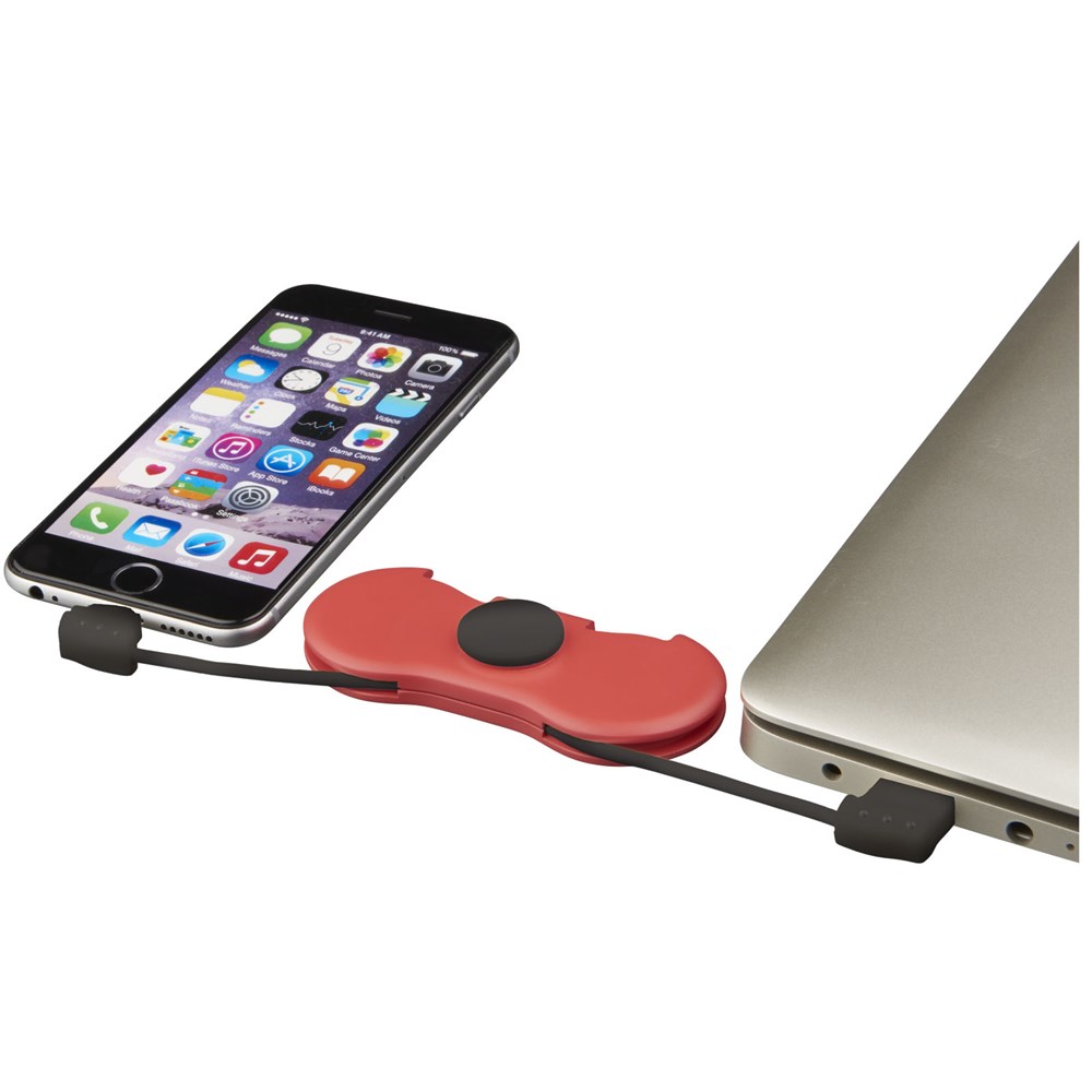 Perfekte Reisekombination, die das Spin-It Widget™ mit Ladefunktion kombiniert. Es enthält ein Ladekabel mit integriertem 2 in 1 Anschluss und Typ-C Anschluss im Slot. Spielen und Aufladen zur gleichen Zeit! CPSIA konform.