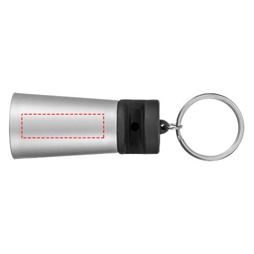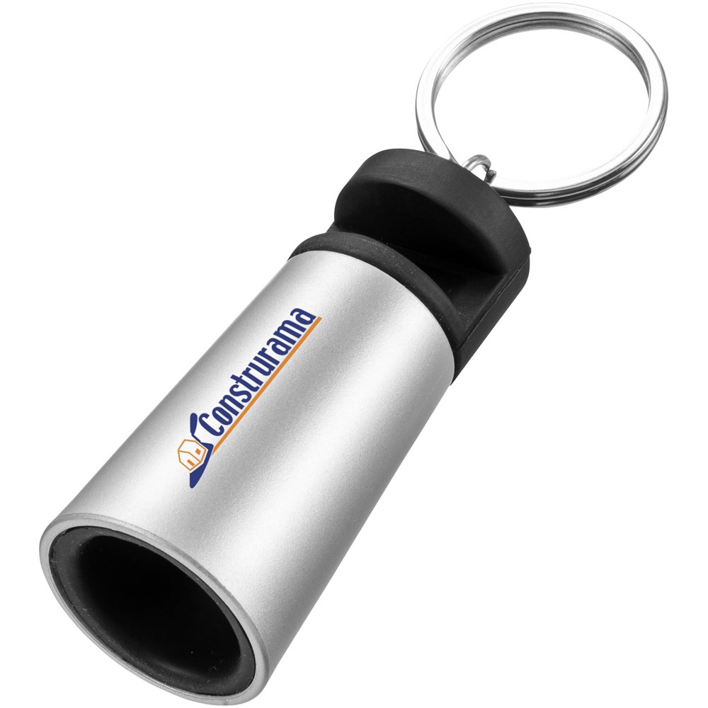 Handlicher Medienständer mit integriertem Verstärker an einem geteilten Schlüsselring aus Metall. Mit iPhone®-Geräten kompatibel.