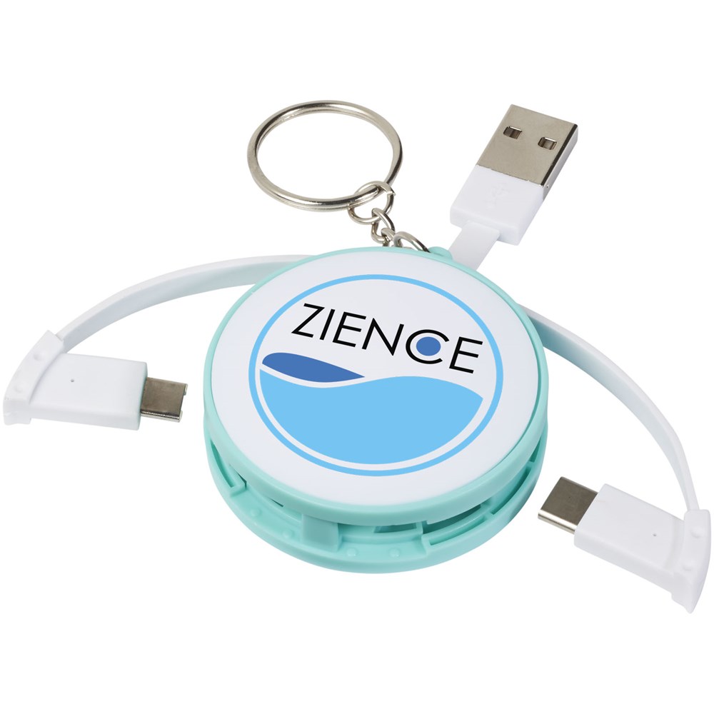 Dieser 3-in-1-Wrap-around-Schlüsselanhänger besteht aus einem USB-A-Kabel, einem Highspeed-USB-C-Kabel und einem mit iOS- und Android-Geräten kompatiblen 2-in-1-Anschluss. Die Kabel können zur Aufbewahrung um den Hauptteil eines Gerätes gewickelt werden. Verfügt für unterwegs über einen Schlüsselanhänger. iOS-Geräte werden über den Anschluss ohne Ladestifte geladen. Zum Laden von Android-Geräten ist die andere Seite mit Ladestiften zu verwenden.