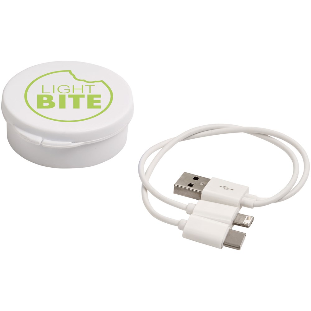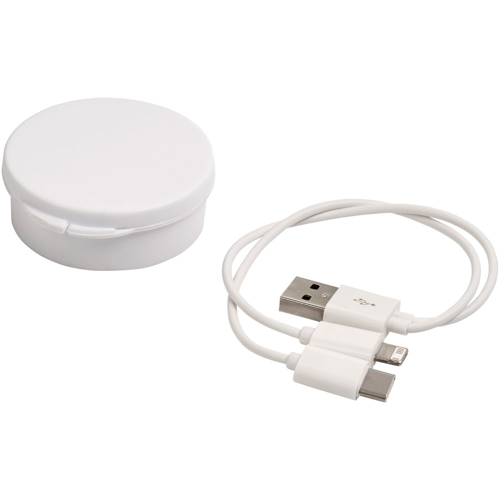 Das Versa 3-in-1-Ladekabel wird in einem runden Etui mit einem USB-Mehrfachkabel geliefert, das einen USB Typ C-Stecker und einen doppelt kompatiblen 2-in-1-Stecker für Apple® iOS- und Android-Geräte enthält.