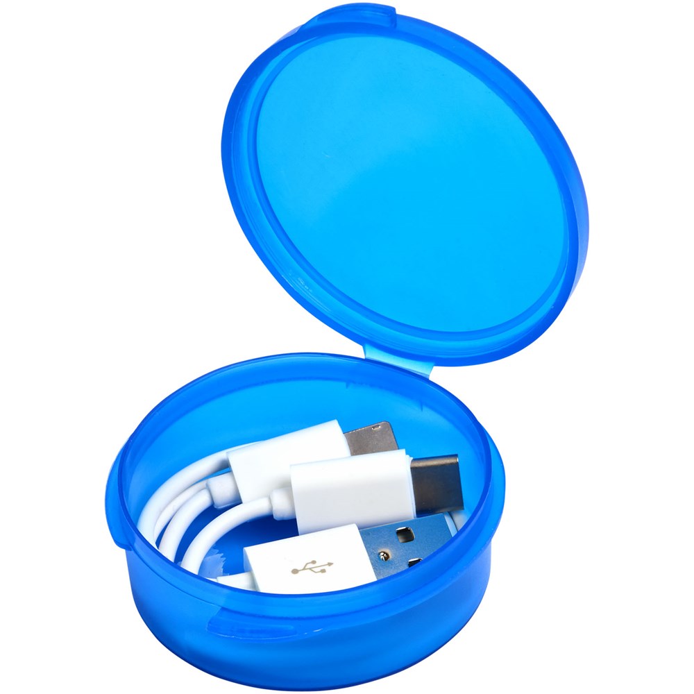 Das Versa 3-in-1-Ladekabel wird in einem runden Etui mit einem USB-Mehrfachkabel geliefert, das einen USB Typ C-Stecker und einen doppelt kompatiblen 2-in-1-Stecker für Apple® iOS- und Android-Geräte enthält.