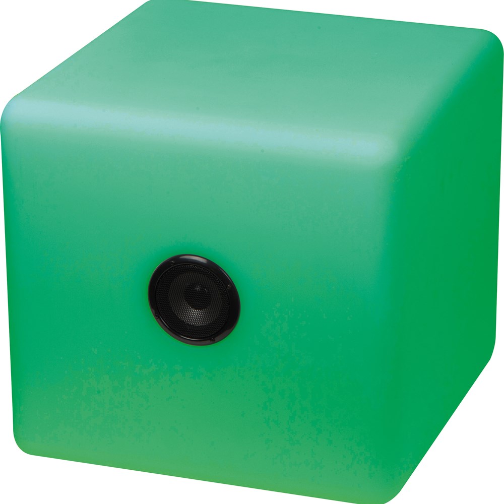 XXL Bluetooth Lautsprecher mit wechselnder LED-Beleuchtung, Akku mit einer Leistung von 2.200 mAh und Netzstecker. Der Lautsprecher hat eine Reichweite von 8 Metern und eine Laufzeit von 12 Stunden (Licht und Musik 6 Stunden). Die Werbung wird auf den Lautsprecher gedruckt.