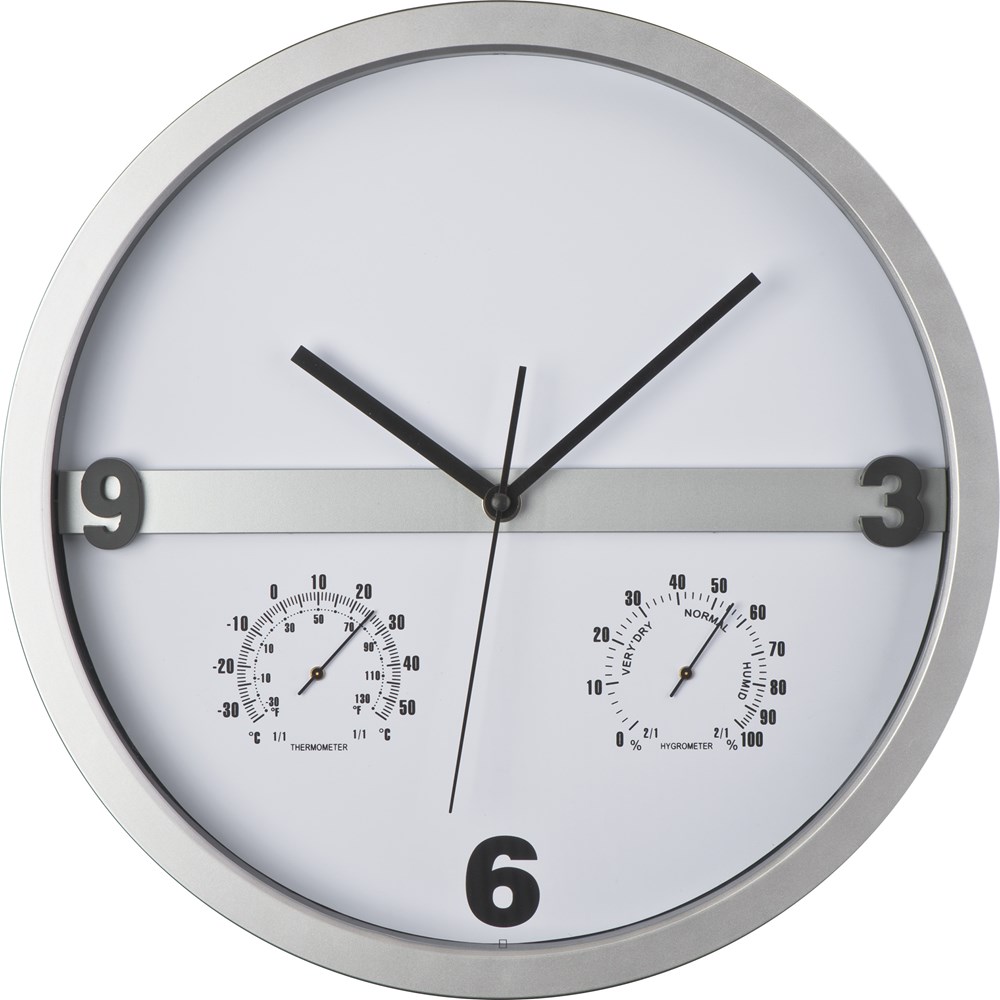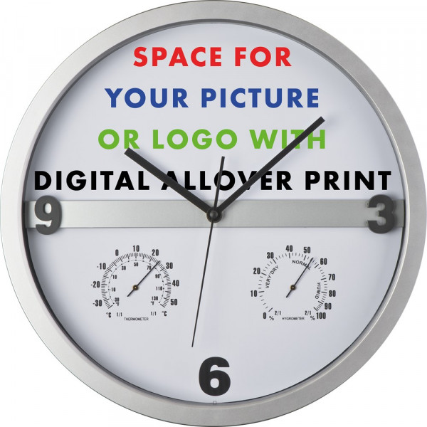 Wanduhr mit Hygro - und Thermometer, halbes Display bedruckbar