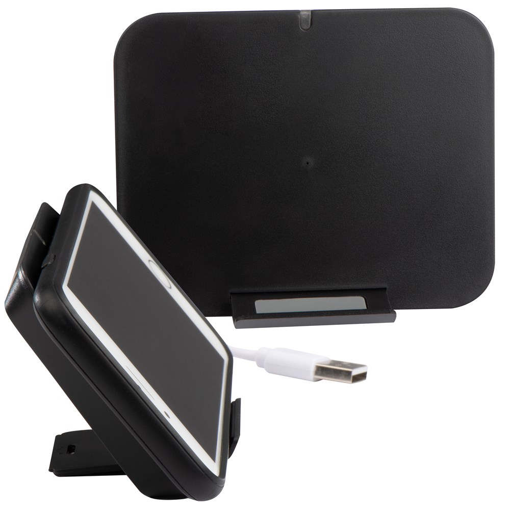 Induktionsladegerät aus Kunststoff, laden Sie Ihr Smartphone einfach ohne Kabelverbindung auf. Der Wireless Charger dient gleichzeitig auch als Ständer für Ihr Smartphone. Die Werbung wird vorne auf das Induktionsladegerät gedruckt.