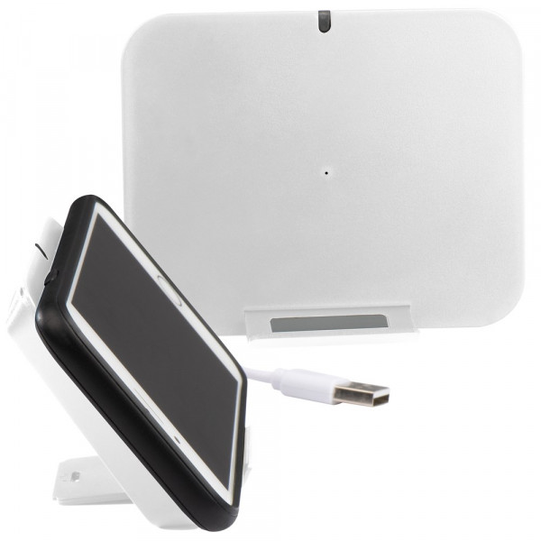 Induktionsladegerät aus Kunststoff, laden Sie Ihr Smartphone einfach ohne Kabelverbindung auf. Der Wireless Charger dient gleichzeitig auch als Ständer für Ihr Smartphone. Die Werbung wird vorne auf das Induktionsladegerät gedruckt.