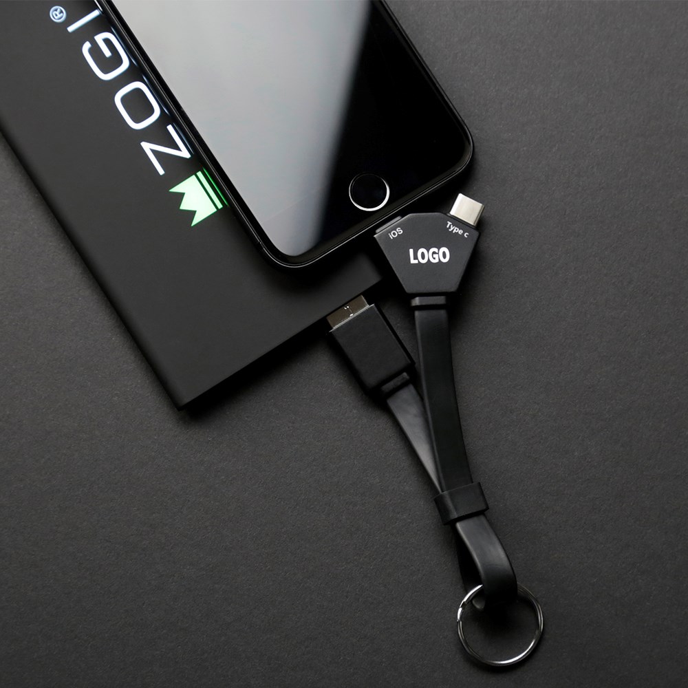 Das Multitalent aus der GLOW Familie. Egal, welches Gerät Sie gerade aufladen möchten, dieses 2 Ampere Ladekabel verbindet Type C, Lightning- und Android (Micro-USB) Adapter in einer verblüffend praktischen Weise und sorgt gleichzeitig dafür, dass Ihren Kunden buchstäblich ein Licht aufgeht. Denn Ihr Logo wird als Gravur bei Benutzung effektvoll beleuchtet und ist somit immer im Fokus der Aufmerksamkeit. Inklusive Schlüsselring.