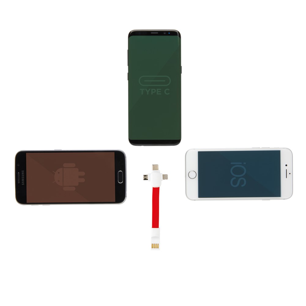 3 verschiedene Anschlüsse: Micro-USB, Type-C und eine zweiseitige Verbindung für iOS und Android lässt Sie so alle Geräte laden - auch zur Datensynchronisation geeignet. Die Enden sind magnetisch und lassen sich so ganz einfach miteinander verbinden um das ganze kompakt mit zu nehmen.