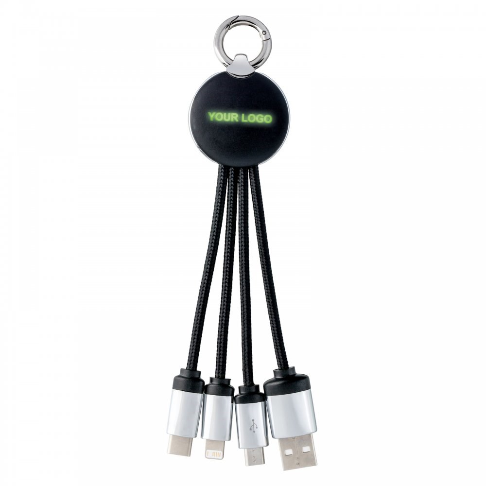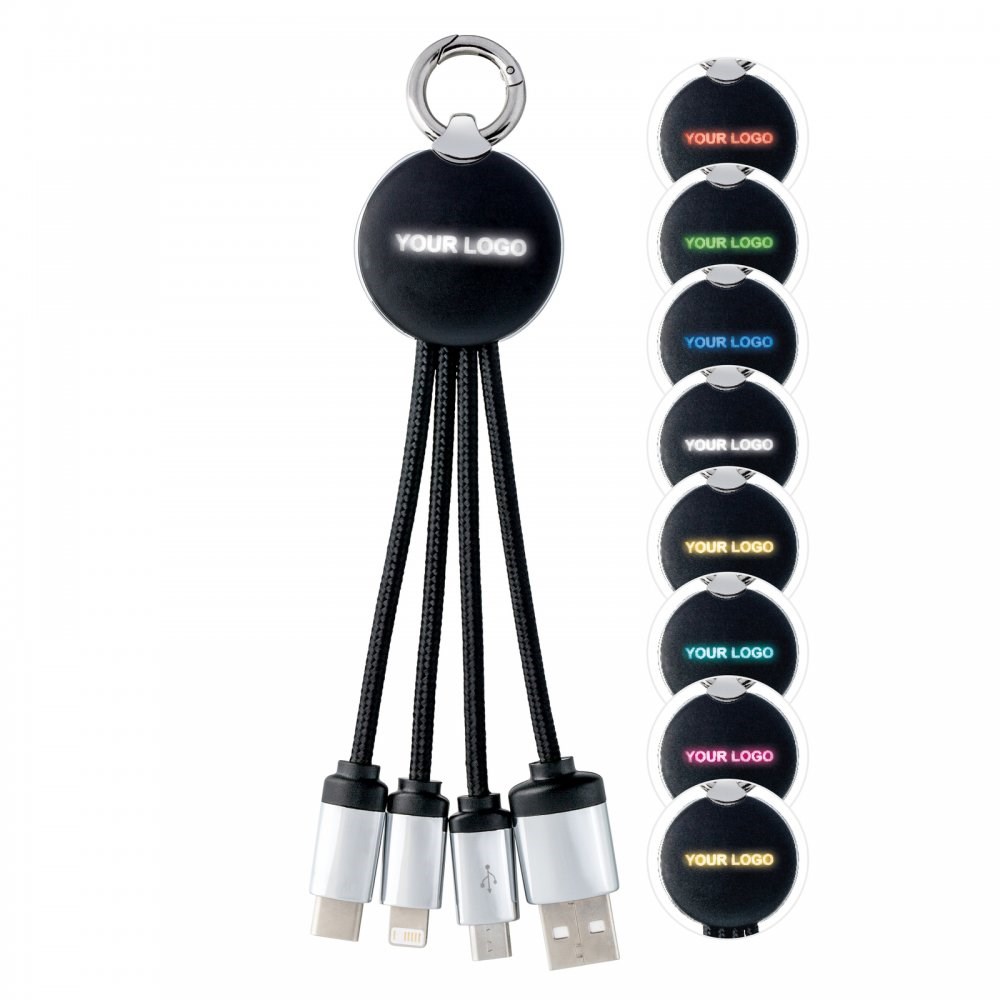 Das Multi-Ladekabel mit 6-Pin-Kabel für Geräte von Apple®, Micro USB und USB-C. Der per Laserdruck veredelte Bereich Ihres Logos wird je nach Modell blau, rot, grün, weiß oder mit Wechsellicht hinterleuchtet und wirkt so besonders apart. Apple® is a registered trademark of Apple Inc. registered in the US and other countries.
